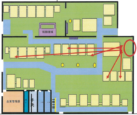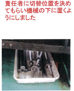使用場所の近くに必要な物を置くという発想は5S整頓の基本ですが、切替作業という特定業務に絞った動線改善と、ピンという小物の管理に着目した点は、現場ならではの視点があり、B評価とします。