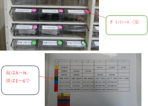 引出しにポイントシール貼り番地を付け、一覧表を作りわかりやすくなった。